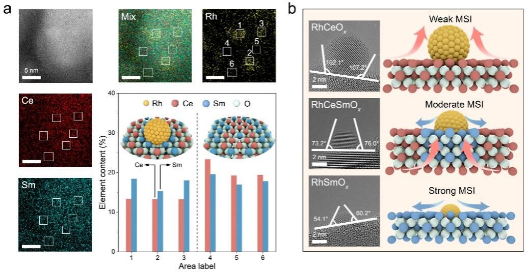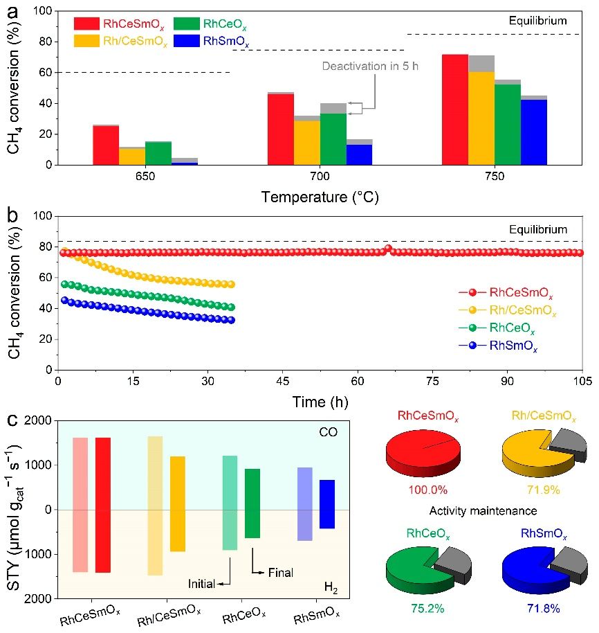 催化研究表明,溶出后的铑-铈-钐三元氧化物在甲烷干重整的苛刻反应条件下表现出高活性和长期稳定性(图2)。研究人员通过对铑-铈二元氧化物、铑-钐二元氧化物和铈-钐二元氧化物负载的铑颗粒的失活分析发现,单一金属与载体之间的相互作用或弱金属-载体相互作用难以抑制铑物种的烧结并可能引发积碳的生成,从而危及催化剂的稳定性。在铑-铈-钐三元氧化物中,平衡的金属-载体相互作用有助于纳米颗粒的均匀析出和结构的稳定性,能为未来设计和制造高效甲烷干重整催化剂提供启示。