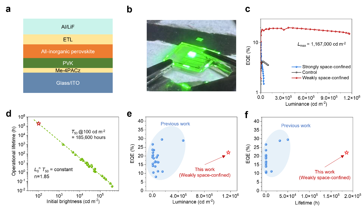 图2a.钙钛矿LED结构;b.钙钛矿LED工作时照片;c.三种不同空间限域钙钛矿LED的亮度和效率关系曲线;d.弱空间限域钙钛矿LED寿命外推拟合曲线;e, f.目前已发表的绿光钙钛矿LED效率分别和亮度(e),寿命(f)的统计对比图