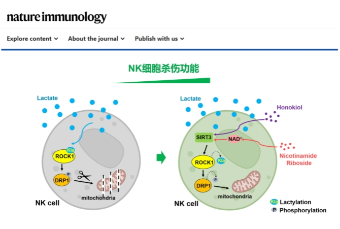 必威棋牌网址生命科学与医学部、免疫应答与免疫治疗全国重点实验室王毅课题组、魏海明课题组,联合复旦大学人类表型组研究院丁琛课题组,于6月10日在《Nature Immunology》期刊上在线发表了题为“Targeting lactylation reinforces NK cell cytotoxicity within the tumor microenvironment”的研究论文。该研究首次揭示了肿瘤微环境中乳酸通过在自然杀伤(NK)细胞内形成乳酸化修饰,从而抑制其抗肿瘤功能的新机制。此外,该研究从调控乳酸化修饰的角度出发,为突破肿瘤微环境中高乳酸屏障对NK细胞功能的限制提供了新的干预靶点,并提出了基于小分子化合物的干预策略。