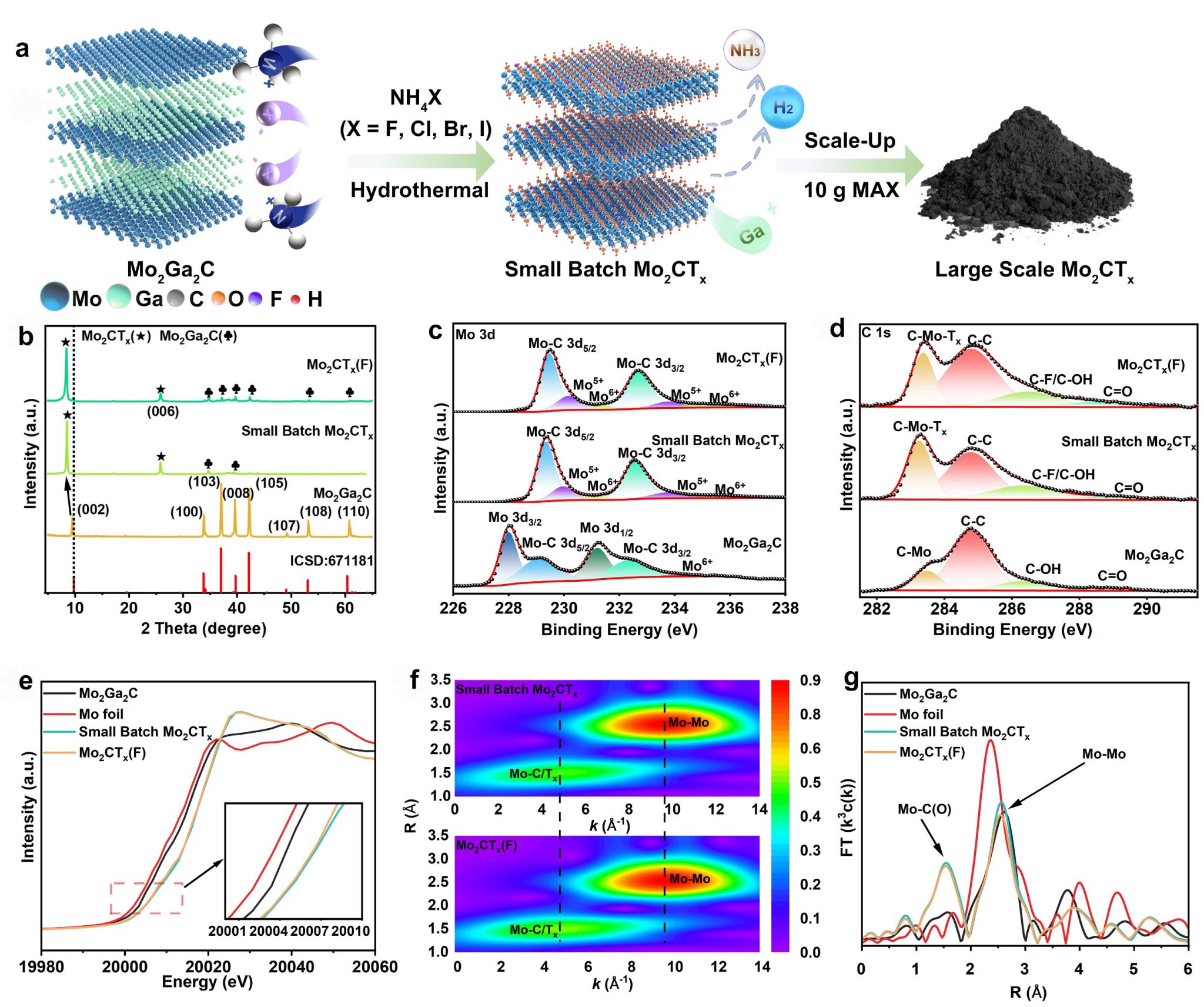 研究团队首先通过理论计算,揭示了卤素离子刻蚀机理及氟化铵分子在刻蚀反应热力学和动力学上的优越性。基于模拟数据指导,首次提出了氟化铵水热刻蚀新策略,并在220°C条件下 6小时完成了10克Mo₂Ga₂C前驱体的刻蚀,实现了单批次产量超过5克的碳化钼MXene的可控制备。