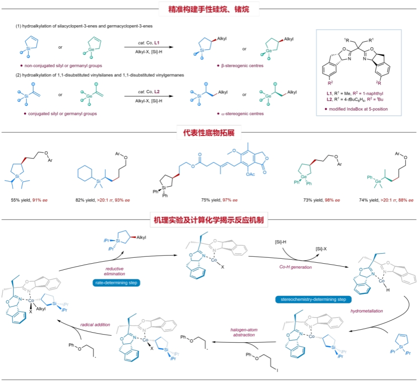 研究团队开发了钴催化含硅、锗烯烃的不对称氢烷基化新策略。通过配体结构定向修饰,实现了对立体化学决定步骤——烯烃氢金属化步骤的选择性精准控制,建立了非共轭硅基团诱导的高区域选择性和高对映选择性控制新模式。该反应体系展现出宽广的底物适用范围和优异的官能团兼容性,对复杂药物分子修饰表现出良好的反应效果。所得β-手性硅化合物作为关键合成砌块,可经Tamao氧化反应高效转化为天然产物全合成的重要中间体——手性2-烷基-1,4-丁二醇。