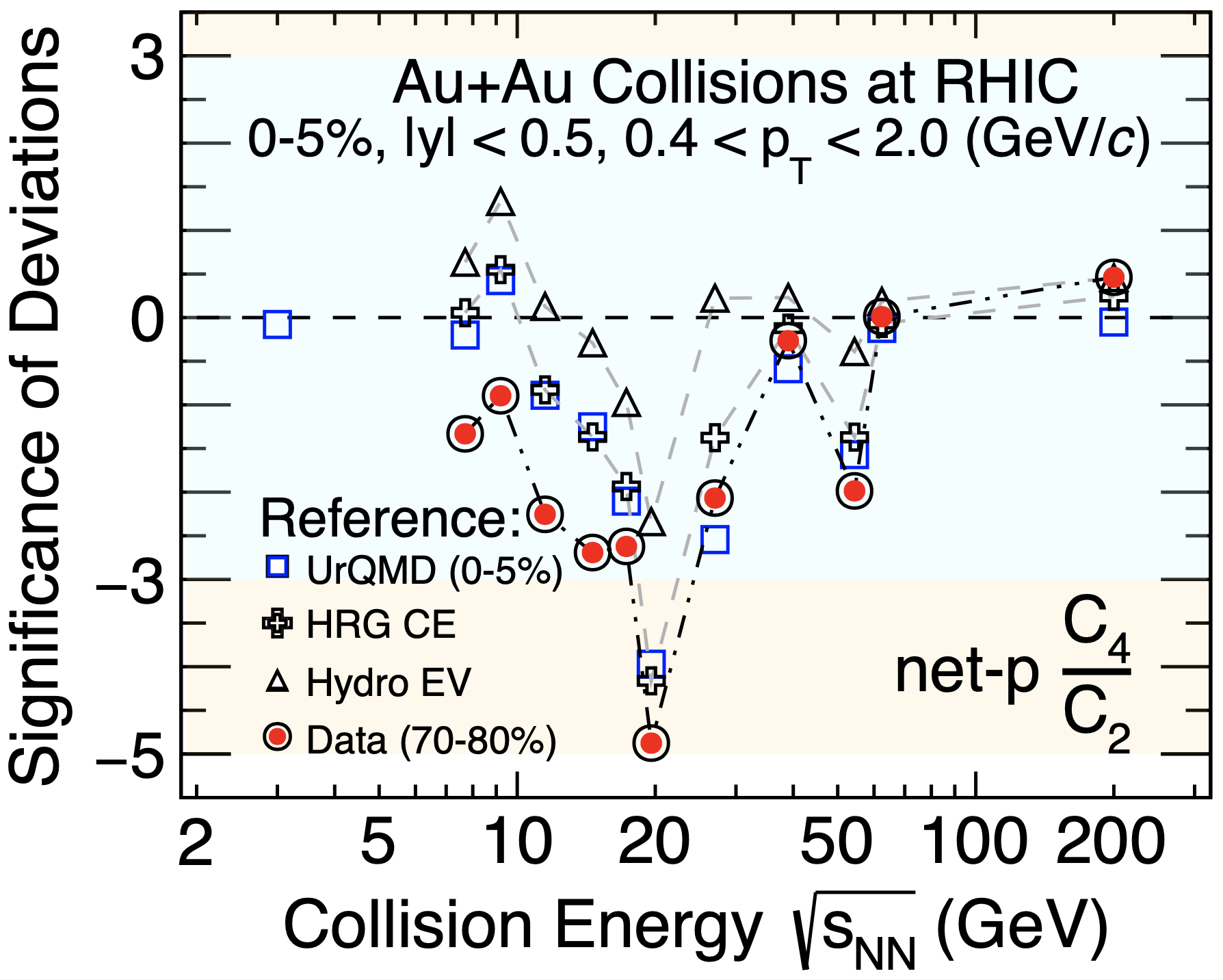 为系统扫描QCD相图,RHIC于2010-2021年实施了两期束流能量扫描项目(BES),其中一期(BES-I)覆盖碰撞能量7.7-200GeV,二期(BES-II)聚焦于7.7-27GeV并大幅提升统计,STAR探测器相应也完成了重要升级。理论指出,逐事件净质子数的高阶涨落是QCD相结构的敏感观测量。这项研究基于STAR采集自BES-II的实验数据,测量了净质子数的至高四阶累积矩。结果显示,四阶与二阶之比在19.6GeV的对心碰撞中相比无临界的基线出现了最大偏离,显著性为2-5倍标准差,而在更高和更低能量则逐渐回归基线。这一现象显示了潜在的临界效应,即可能存在临界点的信号。