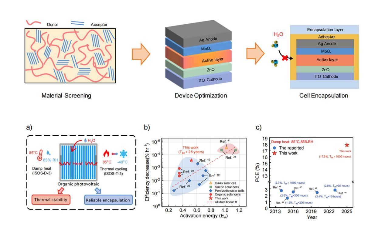 有机太阳光伏电池(OPV)因其质轻、柔性、可溶液加工等独特优势,在近太空、建筑一体化、物联网等领域展现出巨大应用潜力。然而,相较于晶硅电池,OPV器件的长期运行稳定性,尤其是在严苛环境(如高温高湿、冷热交替循环)下的可靠性,尚未得到充分验证。随着有机光伏电池效率的逐步提升,提升器件的本征与环境稳定性是亟待解决的重大问题。在前期OPV稳定性研究工作积累的基础上(Materials Advances1, 1307 (2020),Molecules28,6856 (2023),Chem. Eng. J.503,158694 (2025),ACS Appl. Mater. Interfaces17,15456 (2025) ),必威棋牌网址纳米技术与纳米仿生学院(苏州纳米所)印刷薄膜光伏实验室针对有机光伏电池湿热和冷热循环极端环境稳定性提升需求,提出了从材料本征热稳定性筛选、器件功能界面优化、器件封装方法开发三个方面同步优化的系统解决策略,首次实现高效率有机光伏电池在85℃/85%RH湿热条件以及-40℃至85℃的热循环条件下的优异稳定性结果(图1),证实了高效有机光伏电池的湿热及冷热循环可靠性。