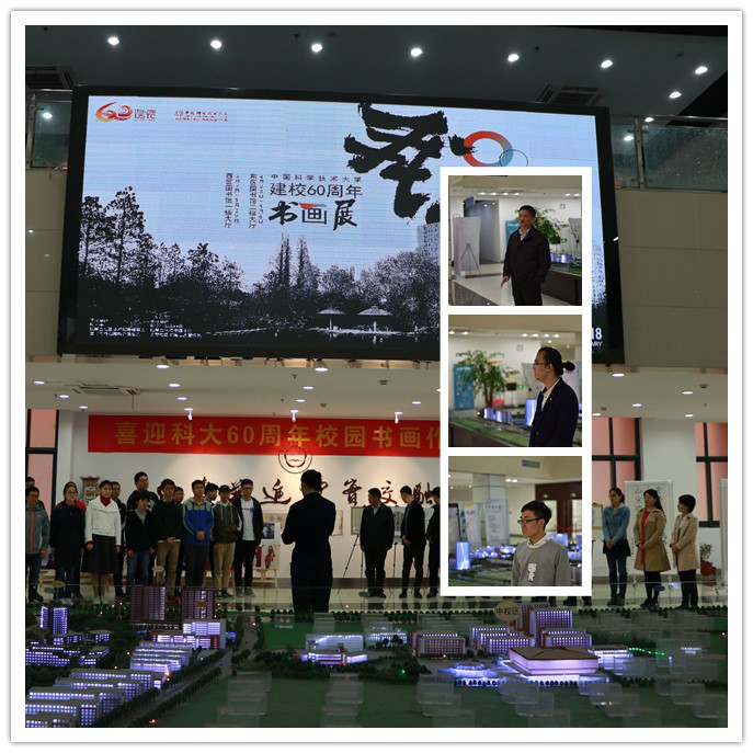 主持人范竹轩同学首先介绍了出席开幕式的领导老师并简要介绍了此次书画展的展品情况。本次迎校庆60周年书画展总共征集了七十余件作品,收集了二十九位同学的原创作品,种类涵盖硬笔、软笔书法、国画、油画、水粉画、电脑作画等,展现出科大同学们的艺术创作能力和艺术想象力。