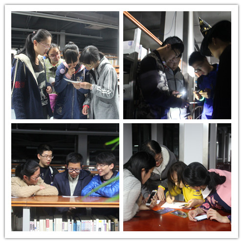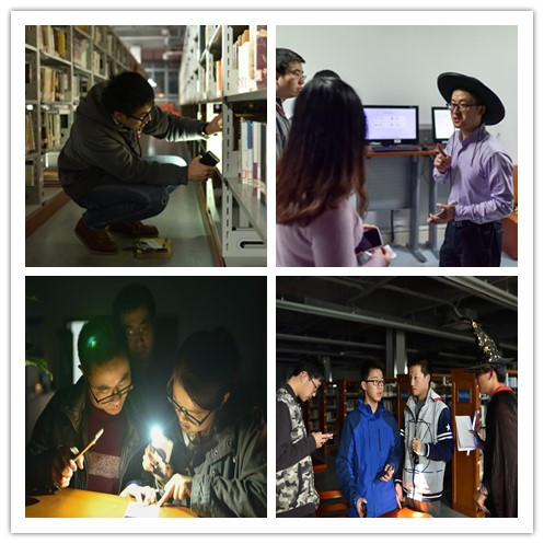 开始时间一到,各队伍蜂拥般进入书库,找到自己的NPC后便开始了这场脑洞大开的奇妙之旅。幽静黑暗的图书馆里传来阵阵书页翻动的声音、激烈的讨论声音、被鬼面装NPC吓到的尖叫声音,以及找到线索完成题目后呼唤同伴大声叫好的声音。活动的背景音乐由爱乐社团提供,给已经很刺激的探秘氛围增添了神秘感。摄影协会的成员穿梭在各个楼层间,用相机记录着参赛队伍或是遇到难题愁眉不解的样子,或是找到思路神采飞扬的神情。