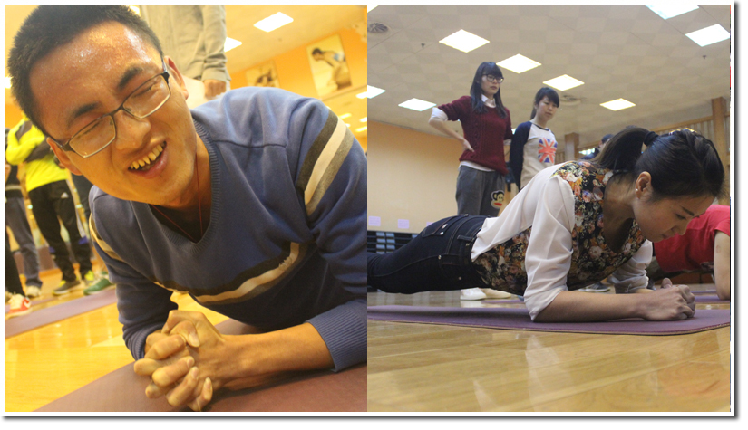 四个单人项目中,最吸引人眼球的就属直板支撑。在健身房大操房里,瑜伽垫铺成一排,同学们挨个趴在垫子上,脚尖和小臂着地,躯干挺直,身体成一条直线,当触地或动作变形即为结束,最后按坚持时间计算积分。各个宿舍纷纷派出实力最强的舍员参加,其他同学则站在旁边加油助威。时间一分一秒过去了,参赛选手们都卯足了劲在坚持,他们额头布满了汗珠,全身也开始颤抖,动作刚要变形,教练就在一旁喝止,他们用余光在观察其他选手的表现,都恨不得是自己坚持到最后。最激动人心的时刻到了,一个又一个选手趴下,只剩下一个女生和一个男生在坚持,他们的亲友团都蹲下来为他们呐喊加油,同学们也纷纷上前围观。只见男生汗珠一滴滴往下流,手臂开始颤抖,腰往下塌,同学们纷纷鼓劲加油。此刻,每个人的心都蹦到了嗓子眼,最终,男生胳膊一抖,整个人瞬间趴在了垫子上,围观同学们都爆发出热烈的掌声,女生此刻才瘫软在地。工作人员看了计时表,喊道“10分37秒,第一名”。这名女生就是潘玲川,她事后笑道,她们宿舍的运动氛围特别好,平常大家经常一起锻炼,她自己每天也会抽时间做直板支撑,只是没想到在极限状态下可以坚持这么久。