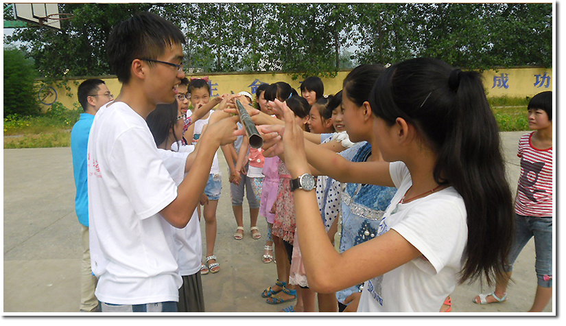 接下来玩的游戏是“齐眉棍”,这是一个考察团队是否同心协力的体验。所有学生用一根手指一起托起一根同心杆,将杆从眉毛平齐的位置慢慢放在地上,在此期间必须保持杆水平且任何人的手不能离开杆,否则将从头开始。此活动深刻揭示了团队合作的重要性。任何人必须与团队保持一致,过快过慢都会导致任务失败。