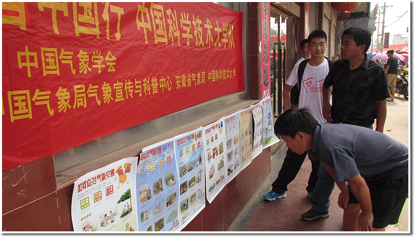 这天正是新马桥镇的逢集日,镇上赶集的乡亲很多,团员们费尽周折才找到一处合适的活动“风水宝地”。经过一番忙碌,实践团的团员们在新马桥镇的集市上开始了气象防震减灾的宣传工作。他们把横幅和海报悬挂在集市中心,很快乡亲们围上来观看,咨询在场的同学活动的具体内容。同时,一些实践团的团员拿着印制好的传单和海报走上街头,向当地赶集的人们介绍一些灾情并向他们宣传减灾的具体措施。