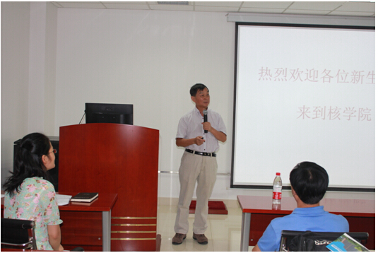 在简单的欢迎辞后,盛六四教授作专题报告,为新生上了进校第一课。他通过科普报告的形式为家长及新生同学普及了核科学技术方面的基础知识,并就目前核科学技术领域的发展状况与前景进行了介绍。在学院和专业介绍部分,他就学院的建院历程、学科建设、科研现状、师资队伍、学生培养目标、往届毕业生去向等情况,并结合自己多年从事大科学工程与装置的管理和研究经验,希望同学们在今后的学习和工作中注重培养责任意识、团队观念和合作精神,通过在核学院的学习成长为高端的科研、工程技术、管理人才。