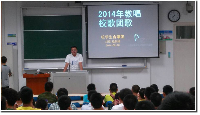8月18日下午,中国科大学生合唱团分别在东区大礼堂与西区礼堂为全体新生教唱校歌团歌,教唱者分别是董梦皓同学(校学生合唱团现任团长)和左训午同学。在之后的几天中,学生合唱团的团员们将走进班级,进行逐班教唱。