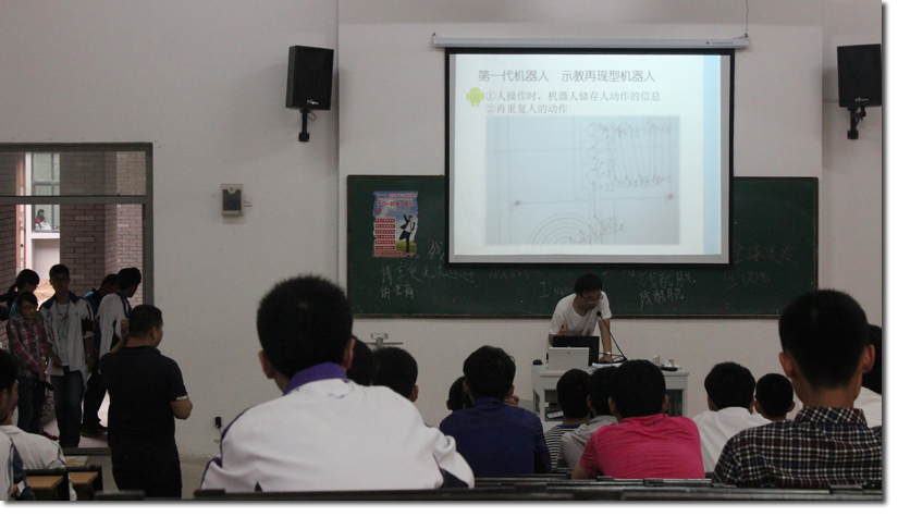 下午四点,活动正式开始。首先,由陈天彤给同学们讲机器人的发展史。同学们认真地听他讲解机器人是如何从人类最初的美好幻想,变成如今高科技、智能化的精灵。随后他又介绍了科大RoboGame机器人大赛的发展以及他自己参加RoboGame机器人大赛时的宝贵经历。他的演讲让更多同学了解到了机器人的发展历程和发展方向。与此同时,他与同学们分享了自己做机器人的各种乐趣。