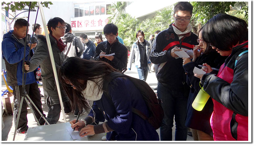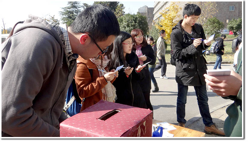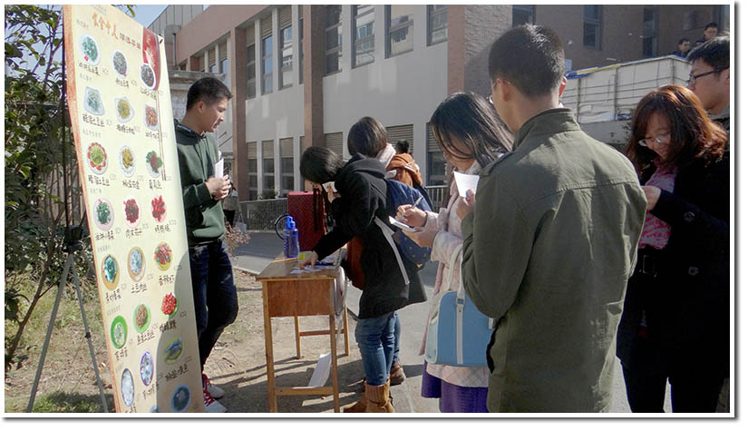 11月23日至29日中午,经过紧张的前期准备工作,在三个投票点同时开始向同学们征集选票。现场投票人数众多,气氛热烈,同学都根据自己的喜好投出了公正的一票。参与投票的同学均获得了由食全十美项目组精心制作的纪念卡贴。