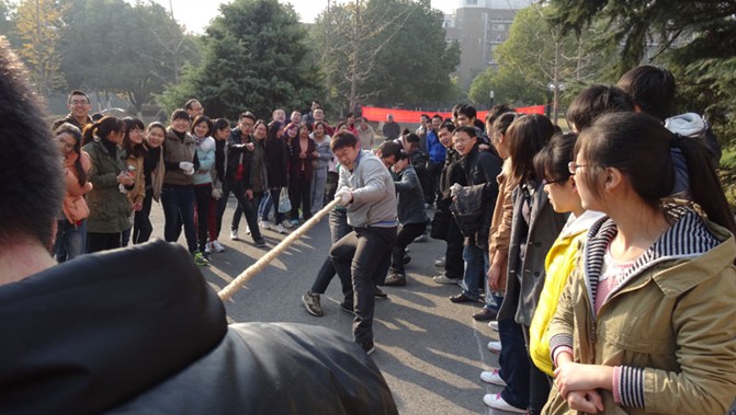 为保证本次比赛的公平性,比赛顺序抽签的方式确定,比赛场地用掷硬币的方式进行选择,比赛方法采用单败淘汰规则,三局两胜决出胜负。上午九点,比赛正式拉开大幕,17支队伍进行了激烈异常的角逐。拔河的双方选手都紧紧握着拔河绳,双脚紧紧地踏着地,身体向后压着;参赛队伍的导师在旁边出谋划策,拉拉队的同学也在旁边拼命地喊着口号,为比赛的队伍加油。比赛现场,欢呼声、呐喊声、口号声,层迭不穷。经过上午激烈的角逐,产生了前四强队伍,他们分别是施蕴渝教授实验室、胡兵教授实验室、魏海明教授实验室以及刘海燕教授实验室。
