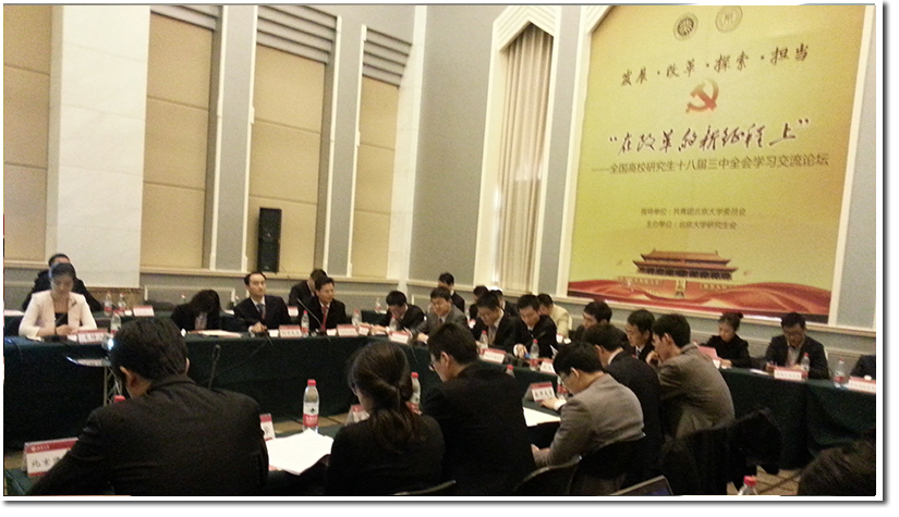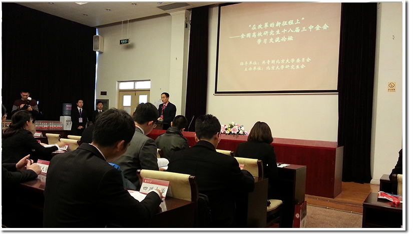 11月16日,“在改革的新征程上”——全国高校研究生十八届三中全会学习交流论坛在北京大学召开。我校研究生会主席屈直同学和来自全国二十多所高校的研究生会代表参加了本次会议。