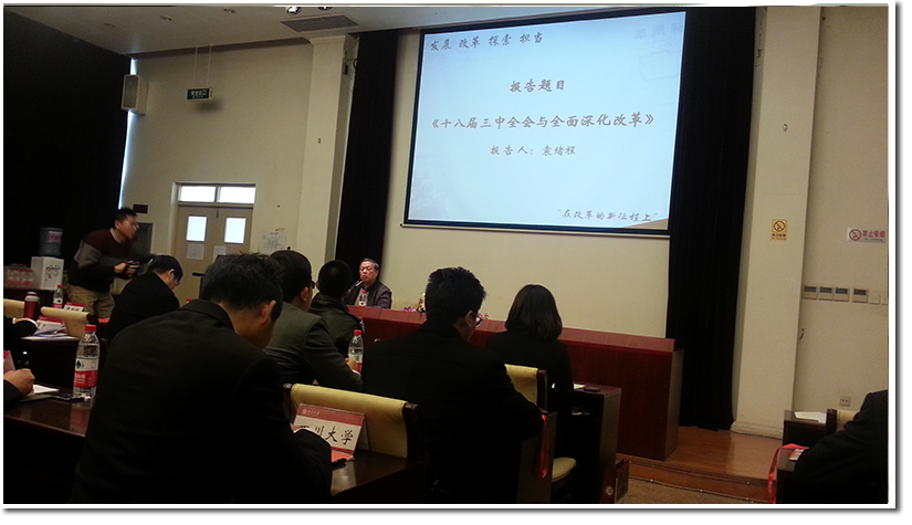 随后,由中国经济体制改革研究会副秘书长袁绪程研究员作题为《十八届三中全会与全面深化改革》的主题报告。他特别强调了十八届三中全会将市场经济在资源分配中的作用由基础性改为决定性对于国家经济体制改革的重大指导意义。与此同时,他还指出,在实现经济体制的公平公正过程中,我们一定要将产权制度和用途管制区分开来,并且这两个方面同等重要,必须双管齐下才能建立起健康健全的经济体制。就科技创新而言,他提到,我们在创新的过程中要勇于承担风险,不能只看到短视的功利。