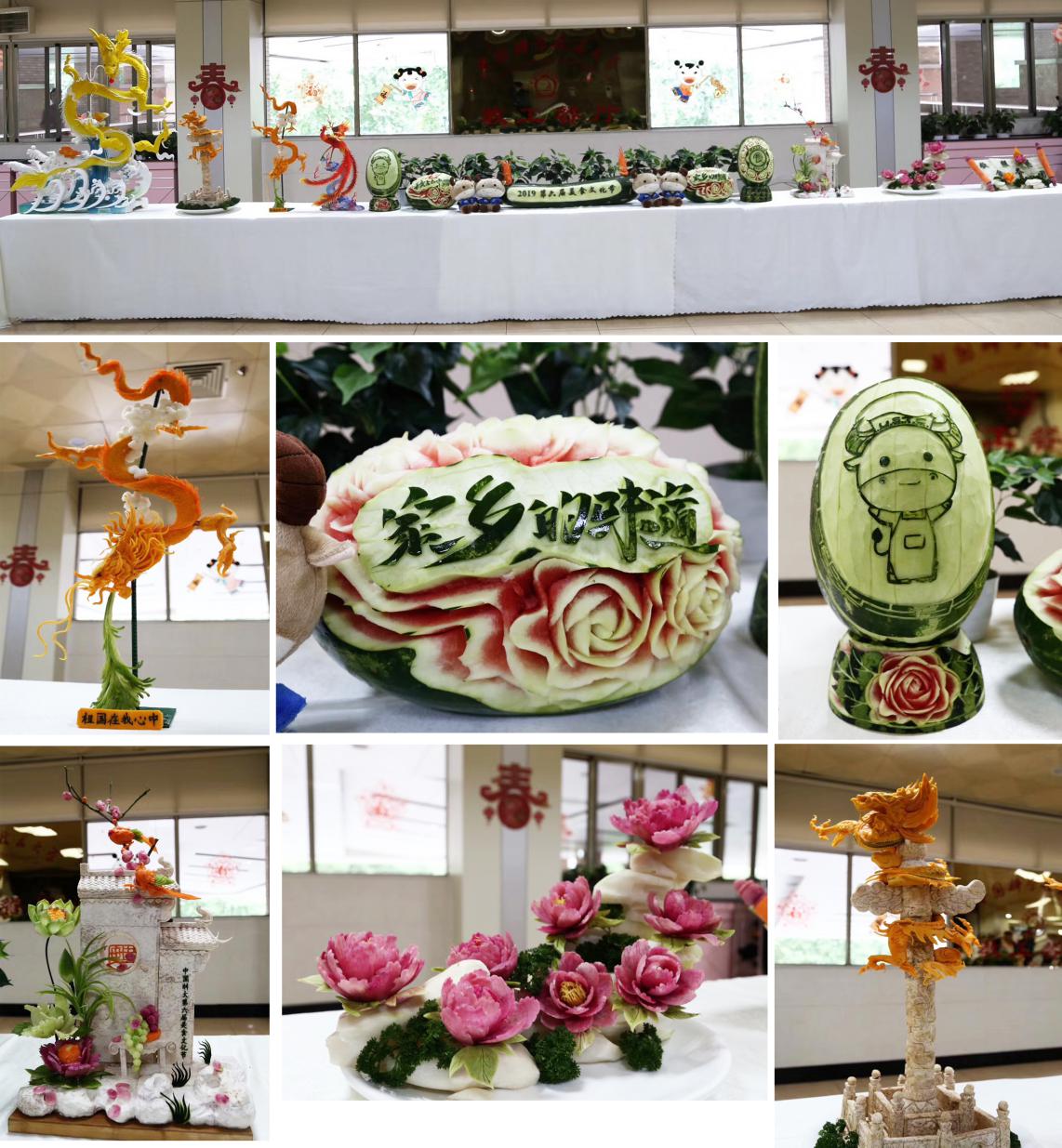 活动现场还陈列了许多用西瓜、南瓜、萝卜等食材雕刻的栩栩如生的艺术品,展示了中华饮食文化的艺术魅力。
