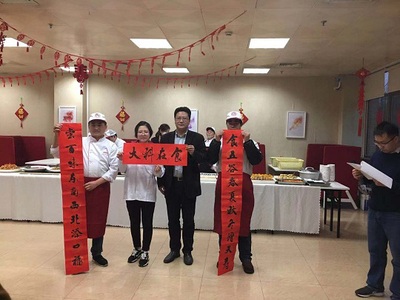 写春联、贴福字是集文学和书法于一体的中国特有的文化形式,是中华民族辞旧迎新的传统习俗。联欢会上,学工部岳兴林老师为在场师生泼墨写新春、挥毫送祝福,并指导同学们自己动手写春联,表达新年美好的愿望。