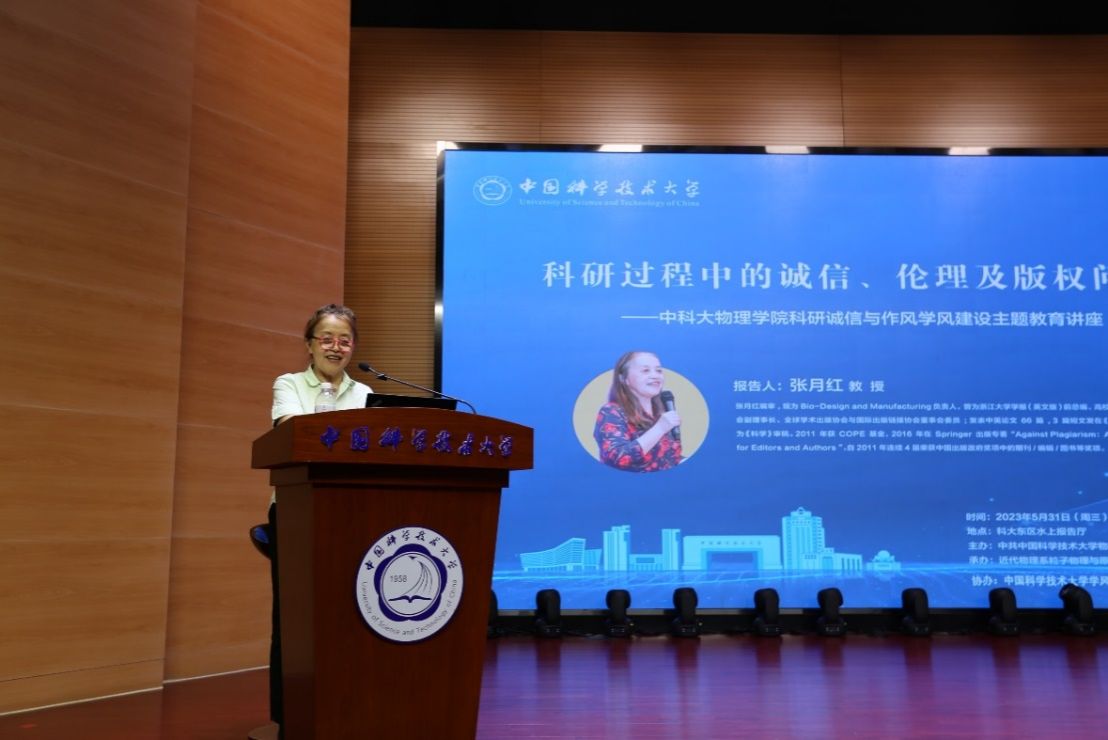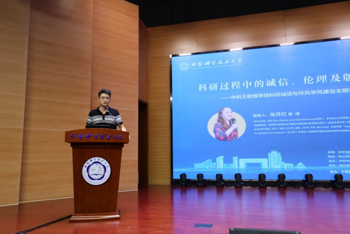 为扎实推进学习贯彻习近平新时代中国特色社会主义思想主题教育,全面贯彻落实习近平总书记关于“要营造良好学术环境,弘扬学术道德和科研伦理”的重要论述精神,5月31日下午,必威棋牌网址物理学院在水上报告厅开展“科研诚信与作风学风建设教育”主题党日活动,邀请《浙江大学学报(英文版)》前总编张月红教授作题为《科研过程中的诚信、伦理及版权问题》的主题讲座。近代物理系粒子物理与原子核物理教工党支部书记石发展主持此次讲座,来自全校感兴趣的师生和科研人员听取了讲座。
