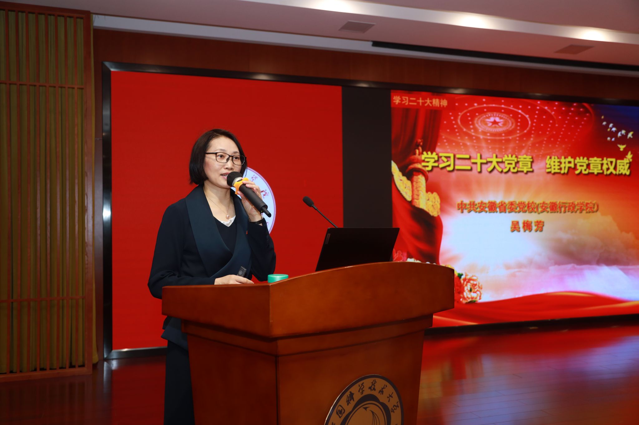 安徽省委党校(安徽行政学院)吴梅芳教授受邀作题为《学习二十大党章 维护党章权威》的辅导报告。吴梅芳从“党历来高度重视制定和完善党章”“党的二十大党章修改的主要特点和主要原则”“党的二十大党章的结构和主要修改内容”“增强党章效力 维护党章权威”四个方面,介绍了党章的发展历史和演进历程,深入分析了党的二十大党章修改的主要特点、主要原则、主要内容,阐述了党的二十大党章的体例结构与逻辑结构。她指出,党章是党的根本大法,是全党必须遵循的总规矩。要抓好党章学习和教育这个基础,将党章内化于心、外化于行;要抓好执行力这个重要环节,把党章变为全党同志自觉遵守的行动准则;要抓好领导干部这个“关键少数”,领导干部要带头学习遵守贯彻维护党章,将党章作为自己的“必修课”。