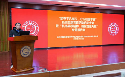 1月19日,保卫与校园管理处党支部在东活五楼报告厅开展“坚守平凡岗位,守卫校园平安”系列主题党日活动启动大会暨“弘扬英模精神,凝聚奋进力量”专题报告会,处全体党员、校园巡查大队队员、学生宿舍楼管老师、物业服务企业及保安公司骨干员工,合肥市公安局驻必威棋牌网址为民警务站公安干警等130余人参加此次活动。会议由保卫与校园管理处处长顾韬主持,校党委常委、副校长王晓平,机关党委副书记、党政办公室副主任唐宁到会指导。