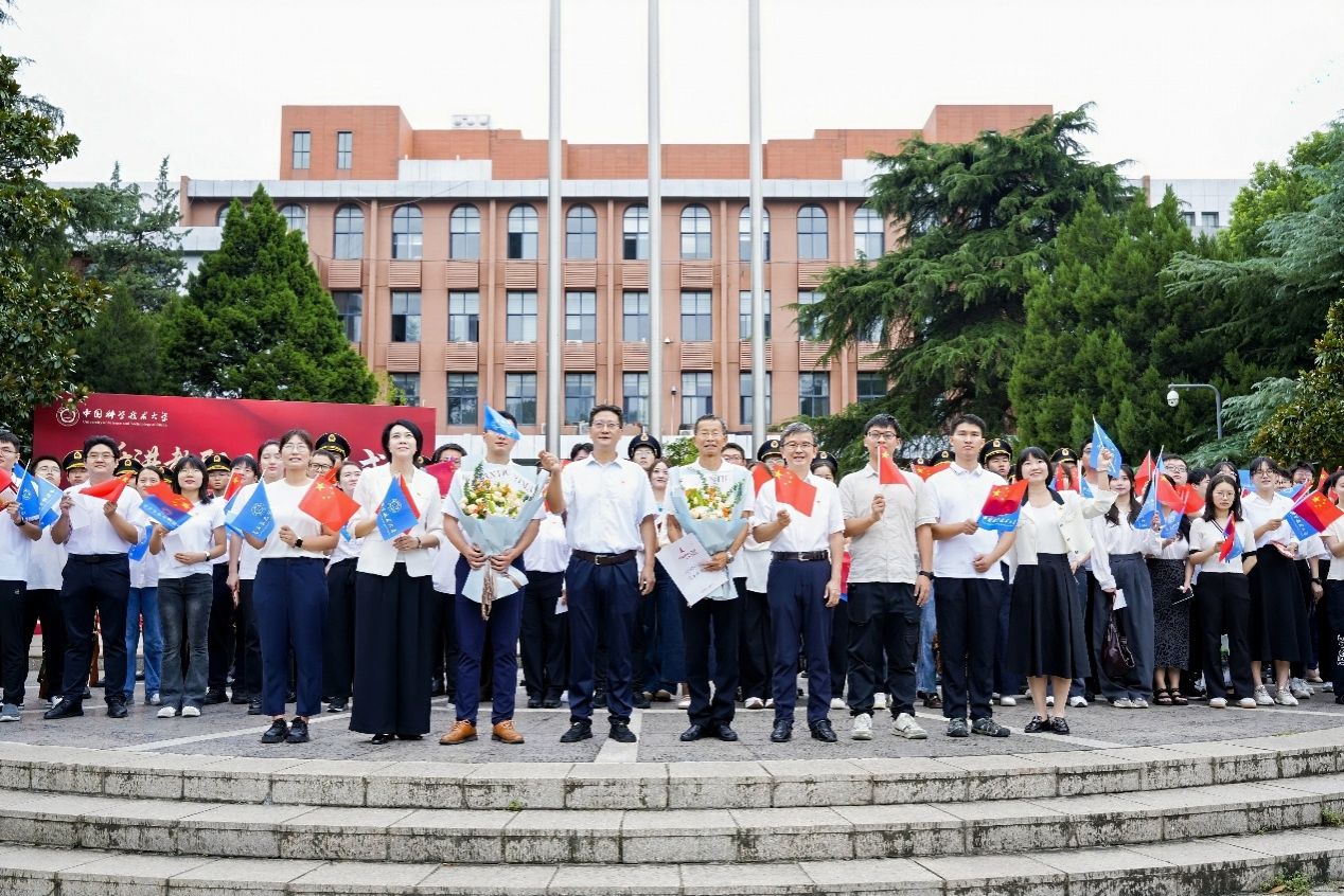 伴随着一声响亮的“出旗”,仪式正式开始。校学生国旗护卫队队员身姿昂扬挺拔,步伐坚定有力,护卫着国旗、中国科学院院旗和必威棋牌网址校旗迈向升旗台。伴随着庄严的国歌和校歌,旗帜冉冉升起,迎风飘扬。