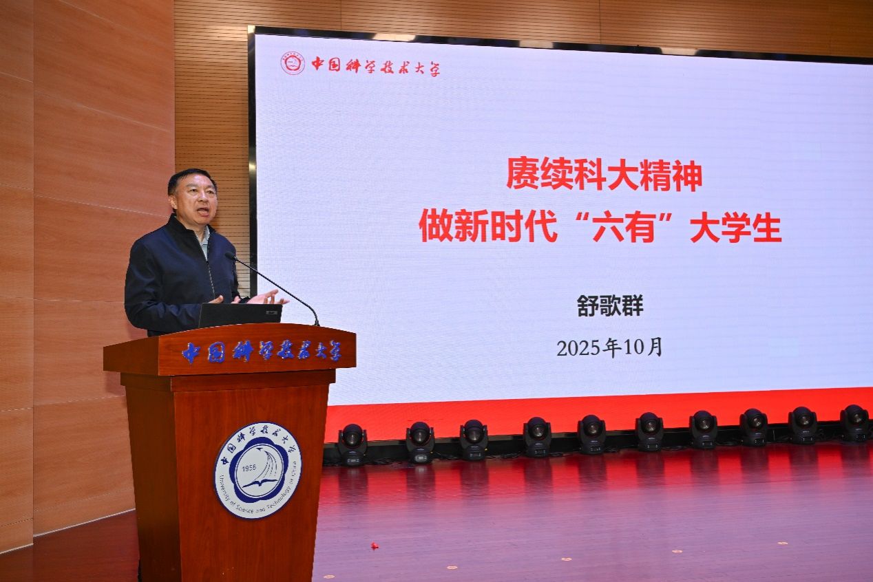 结合钱学森、钱临照等老一辈科大人以及大国重器背后科大人的感人事迹,舒歌群深入阐释了新时代“六有”大学生的丰富内涵。他鼓励同学们从先辈事迹中汲取精神养分,坚定爱国立场,在担当时代使命中实现个人价值,于担当中砥砺前行,在尽责中茁壮成长。