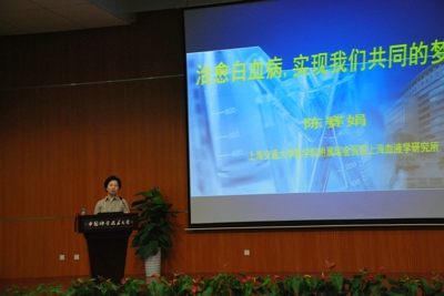 报告会上,陈赛娟院士首先和大家分享了自己科学研究的路程。从1978年在上海第二医科大学考取血液学专业硕士研究生,到1989年在法国巴黎著名的血液病研究中心圣·路易医院血液病研究所获得博士学位,她将白血病的基础和转化医学研究作为毕生的事业。在1989年回到瑞金医院创业初期,她从自己洗试管、烧制蒸馏水开始,白手起家,一步步踏实苦干,终于建立了细胞遗传学和分子生物学实验室。由于事先作了充分准备,在1991年7月—10月受邀访问美国纽约西奈山医院肿瘤研究所威克斯曼教授实验室的短短三个月内,她和同事就发现了急性早幼粒细胞白血病(APL)中PML-RARα转录本的异质性,又在国际上首次克隆了变异型染色体易位t(11;17)中11号染色体受累的基因。
