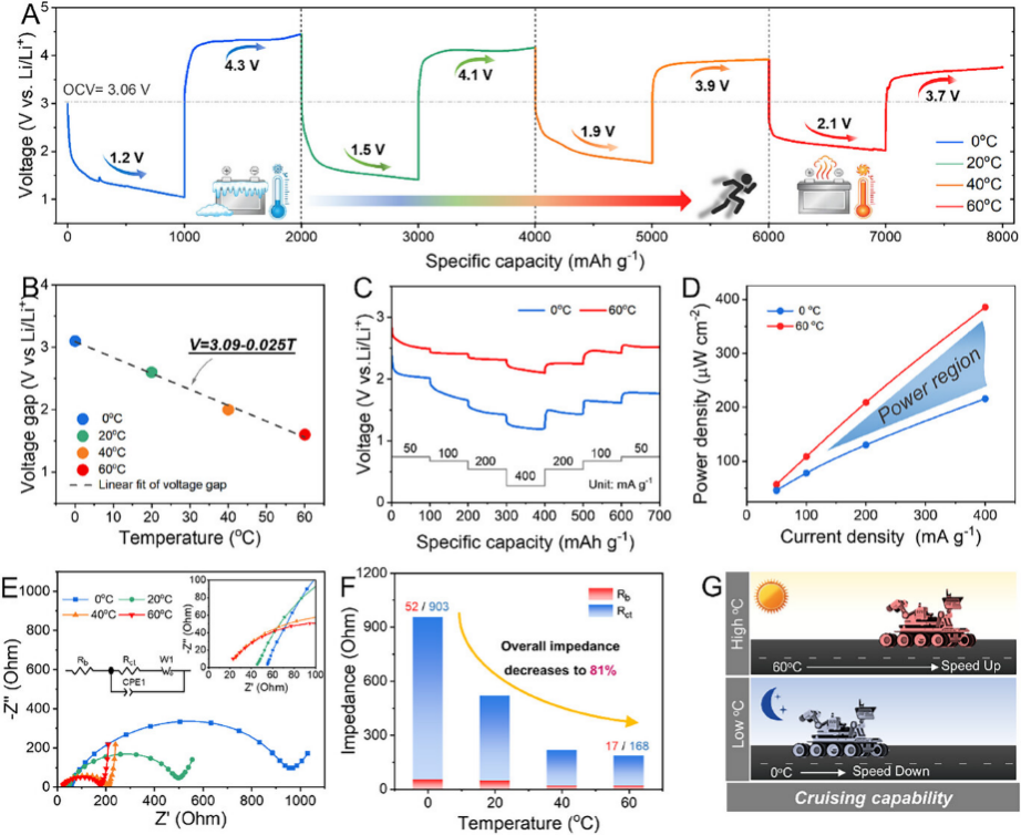 研究团队发现,温度能够驱动反应路径切换与界面重构。温度升高时,电池放电反应从生成固态碳的四电子路径(4Li⁺+3CO₂+4e⁻→2Li₂CO₃+C)转向生成气态一氧化碳的两电子路径(2Li⁺+2CO₂+2e⁻→Li₂CO₃+CO),反应动力学提升两倍。充电过程中,高温环境激发单线态氧等高活性物质生成,使碳酸锂分解效率提升。高温下碳酸锂以孤立三维结构生长,界面二氧化碳浓度相较低温提升四倍,可破解低温界面窒息难题。基于上述机制,团队提出了温度自适应充电协议,在火星昼夜循环中,利用日间高温触发高效分解模式,夜间低温启动保护性慢充策略。通过抑制无定形碳生成、优化固态产物形貌,提高电池功率,可支持火星车夜间持续行驶。