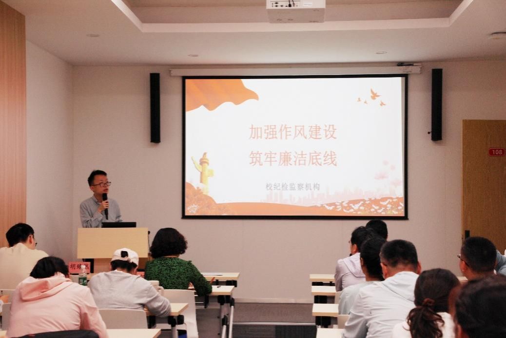 校纪检专员胡臻然作《加强作风建设筑牢廉洁底线》主题宣讲。他指出,要深刻领会党中央对反腐败斗争的形势判断,反腐败斗争要坚决澄清各种错误认识,廓清思想迷雾,进一步坚定反腐败斗争的决心和信心,坚决打好反腐败斗争攻坚战、持久战、总体战。要牢牢把握中央八项规定精神的纪律红线,并结合典型案例深入剖析了公务接待超标、违规收送礼品礼金、违规兴建楼堂馆所、变相公款旅游以及超标准办会等易发问题的纪律边界。最后,他系统梳理了科研经费使用中的典型违规情形及其法律后果,着重强调必须健全科研经费全流程监管机制,确保科研资金规范高效使用。
