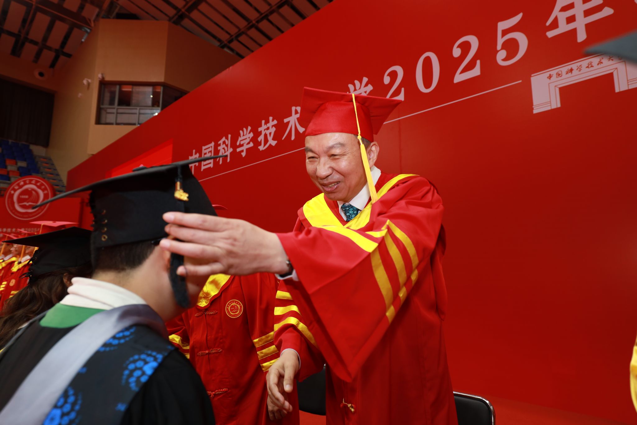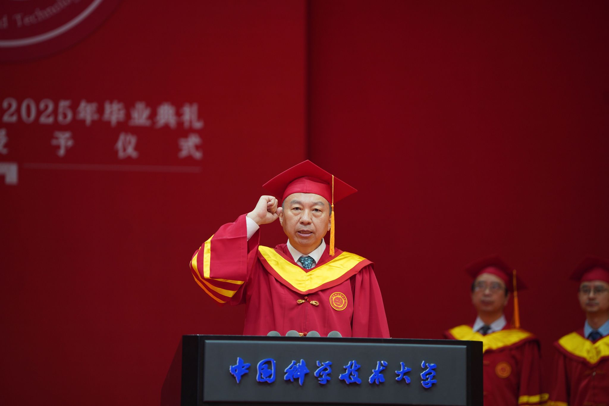 校长常进院士发表题为“襟佩校徽传薪火 肩担使命赴星辰”的讲话。他向毕业生们解读校徽内涵:梅花诠释着自强不息、永不服输的科大风格;书卷承载着勤奋学习、厚积薄发的科大传统;火箭彰显着勇攀高峰、追求卓越的科大气魄。他表示,未来同学们将踏上各不相同的人生道路,但只要始终秉承“红专并进、理实交融”的校训,努力发扬“科教报国、追求卓越”的精神,那么无论相隔多远,都能在“永恒的东风”感召下心心相印、共同前行,希望同学们无论将来奔赴哪片星辰大海,都能牢记总书记嘱托,自立自强、脚踏实地、一飞冲天,成为国家之栋梁、时代之中坚。“老北门前的樱花一直为你们绽放,图书馆里的灯光始终为你们点亮,母校永远是你们最温暖的精神港湾!欢迎常回家看看!”