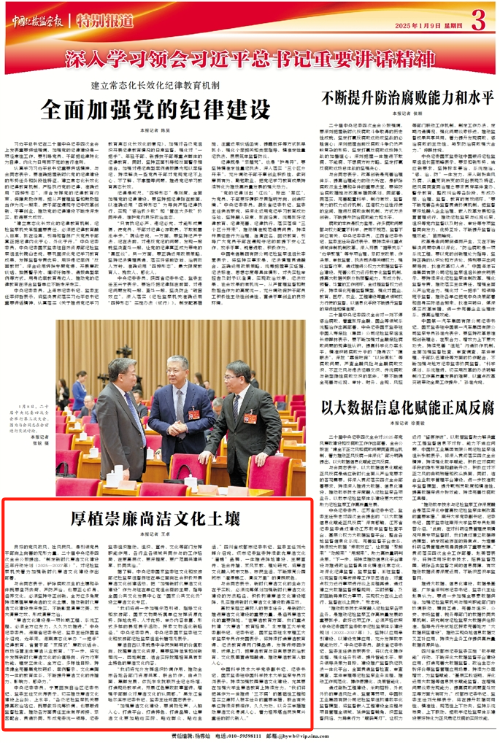 1月9日,《中国纪检监察报》头版刊发的题为《厚植崇廉尚洁文化土壤》的报道:必威棋牌网址党委副书记、纪委书记,国家监委驻必威棋牌网址监察专员刘浏表示,持续加强校园廉洁文化建设,尤其要在加强大学生廉洁教育上持续发力。“我们将把其作为一体推进‘三不腐’的基础性工程和落实立德树人根本任务的重要举措,联合有关单位持续深耕细作,久久为功,以务实举措推动廉洁文化浸润人心,着力培养堪当民族复兴重任的时代新人。”