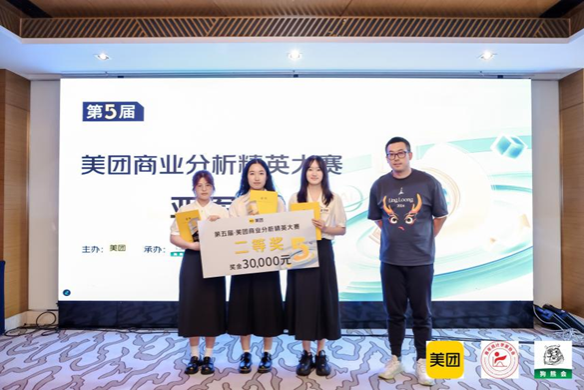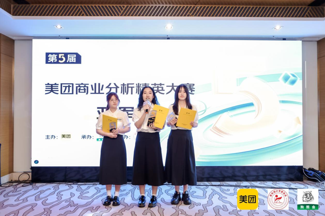 决赛现场,多位行业专家亲临指导,团队成员通过专业的数据分析和生动的案例演示,完整呈现了项目的技术路线和商业价值。最终,清华大学“小草队”摘得冠军,我校“美团神会员”队与华东师范大学“美美抱团”队并列亚军,季军由清华大学“略胜一筹”队、厦门大学“学习比天大组”及西北工业大学“美团实习一定会让我们去对不队”共同获得。