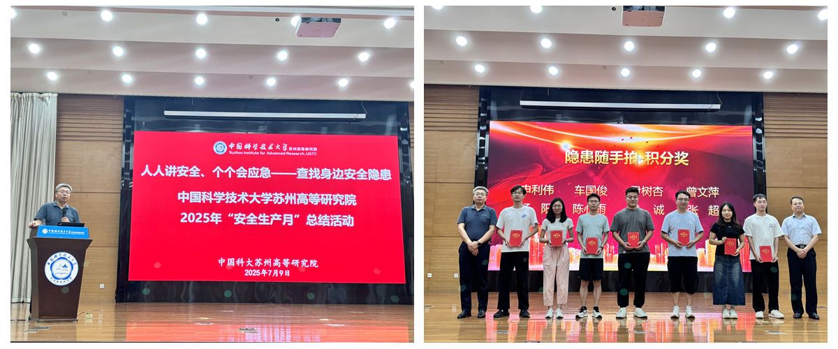 7月9日,苏州高等研究院举行安全生产月总结会,对活动开展情况及检查发现的隐患进行了回顾总结,对在安全知识答题、隐患查找报送等环节表现突出的师生进行了表彰。