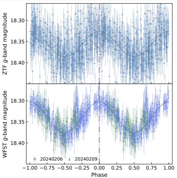 图1:墨子巡天望远镜新发现的白矮星双星系统J0446+7219的相位折叠光变曲线。上图:兹维基暂现源监测站(ZTF)历史数据;下图:墨子巡天望远镜分钟级高频监测数据。受限于观测采样率和信噪比,此前ZTF并未发现该双星系统。