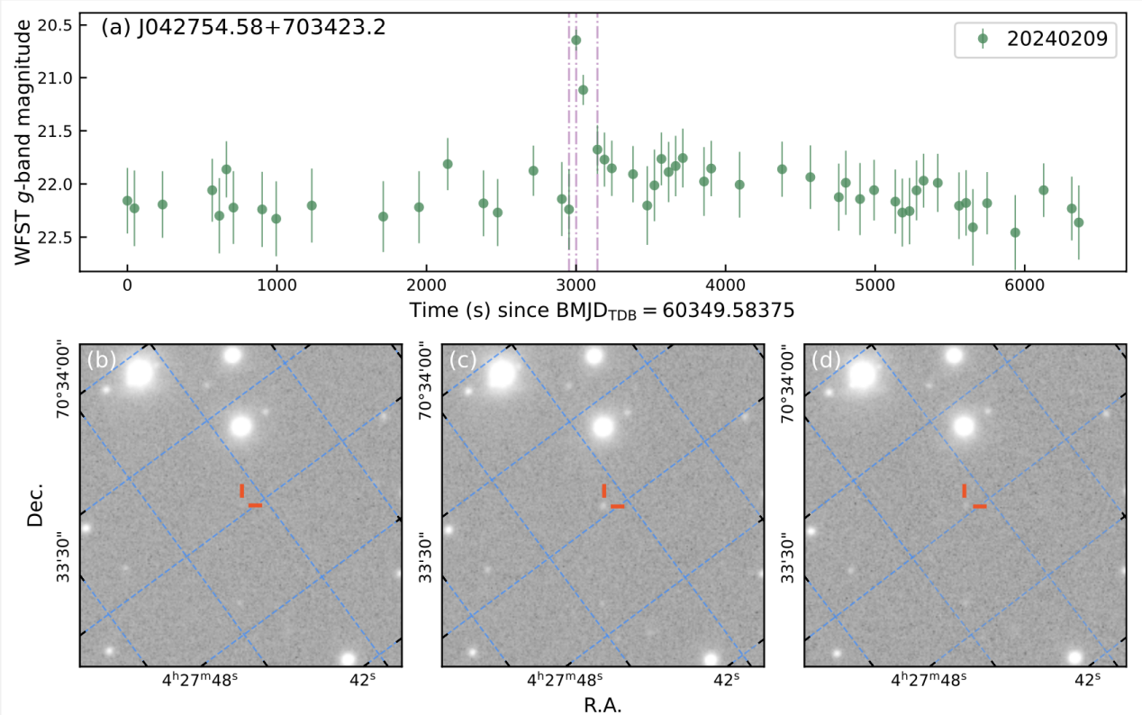 图2:墨子巡天望远镜捕捉的极暗弱耀星J0427+7034的快速耀发事件。上图:耀发过程的光变曲线;下图:不同时刻的望远镜成像图(对应光变曲线中的紫色点划线)。该22等的极暗弱天体在数分钟内亮度骤增近2个星等后迅速恢复。此类暗弱天体的快速耀发事件对观测灵敏度与时间分辨率要求极高,墨子巡天望远镜的分钟级监测为探测这类罕见现象提供了关键手段。
