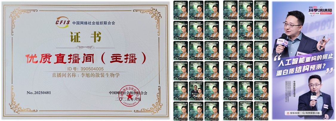 同时,李旭开设的“李旭的散装生物学”科普直播间,因长期坚持开展“硬核”生命健康知识网络普及并取得较大反响,成功入选由中央网信办指导、中国网络社会组织联合会实施的“优质主播培育工程”,获“优质直播间(主播)”称号。