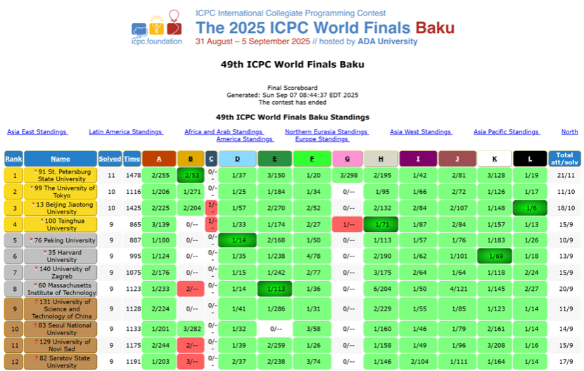 ICPC是全球规模最大、影响力最广的大学生程序设计竞赛之一。本届赛事共吸引了103个国家和地区、3424所高校的73083名学生参与。经过各区域赛的激烈选拔,最终有139所高校脱颖而出,获得全球总决赛的参赛资格。总决赛采用12题制,比赛时长300分钟,共颁发12枚奖牌(4金、4银、4铜)。最终,圣彼得堡国立大学以11题的成绩夺得冠军,东京大学和北京交通大学以10题的成绩紧随其后,清华大学以9题获得金牌。北京大学与必威棋牌网址同样解出9题,因罚时差异分获银牌和铜牌。
