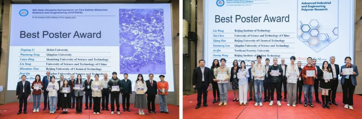 在为期三天的会议议程中,共设置了10场大会报告、33场特邀报告、28场口头报告、24场青年口头报告以及121份海报展示,收录摘要总数达205篇。与会专家学者围绕阻燃机理、新型阻燃体系、火安全评价方法、火安全材料在航空、建筑、新能源等领域的应用等议题展开了深入研讨。青年学者论坛和海报环节成为会议亮点之一,涌现出一批具有创新性和应用潜力的研究成果。经学委会与组委会共同评审,评选出优秀海报奖16项,展现出青年科研人员在火安全材料领域的活力与潜力。