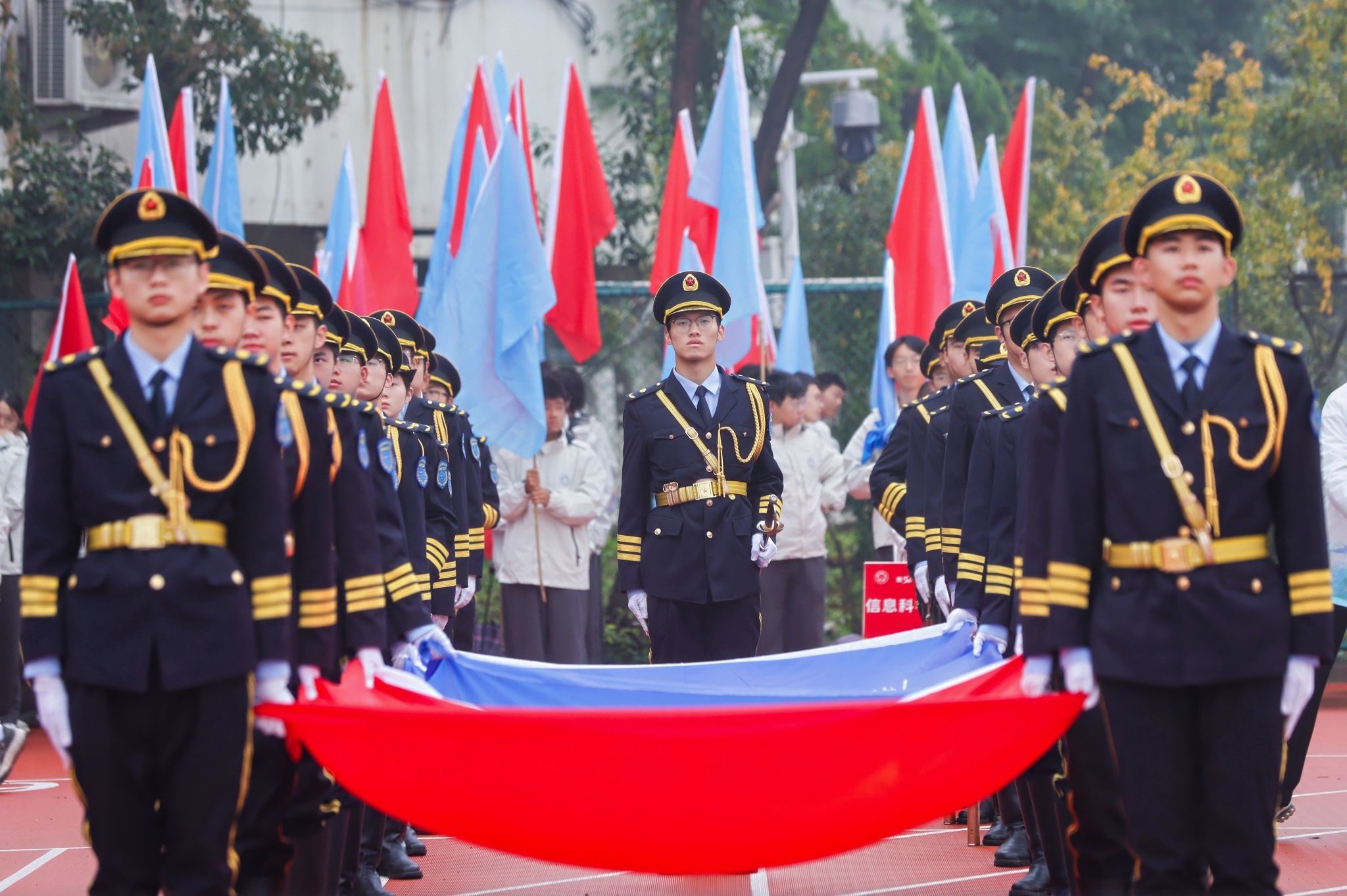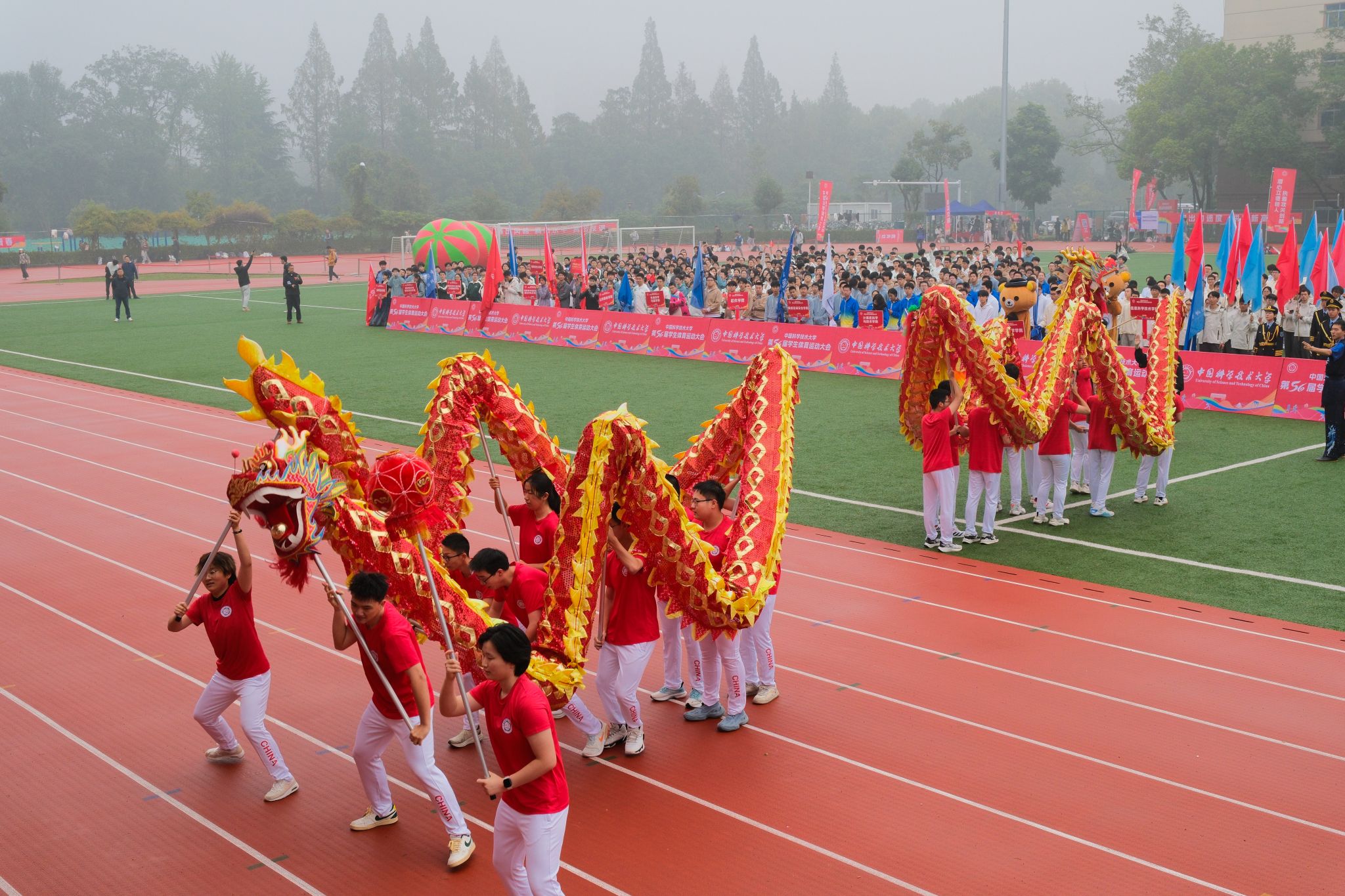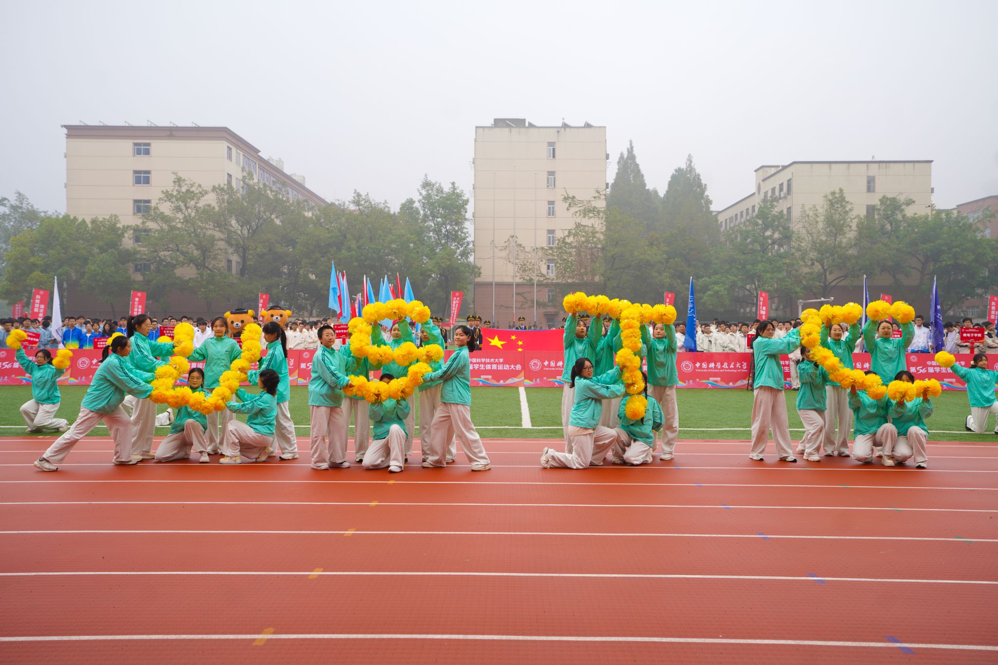 开幕式伊始,国旗护卫队擎着国旗与校旗,迈着铿锵正步走过主席台。校旗队、彩旗队和各院系、重点科研机构的代表方阵依次入场。彩旗队以红蓝旗帜的鲜明搭配亮相,数学科学学院方阵携萌趣小熊同台展示,计算机科学与技术学院方阵借助科技感校徽展示牌、特色旗帜与渐变队服呈现学科特色。“应用化学,追求卓越”“先研力量,势不可挡”“管院健儿,扬帆起航”……各代表队以创意标语结合彩旗、玩偶、服装等道具,尽显科大特色。校级体育运动代表队喊出“科大加油,科大必胜”压轴出场。