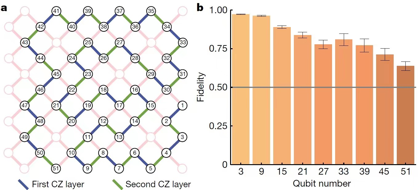 △利用“祖冲之二号”完成的51比特一维簇态制备的线路及量子态保真度结果。