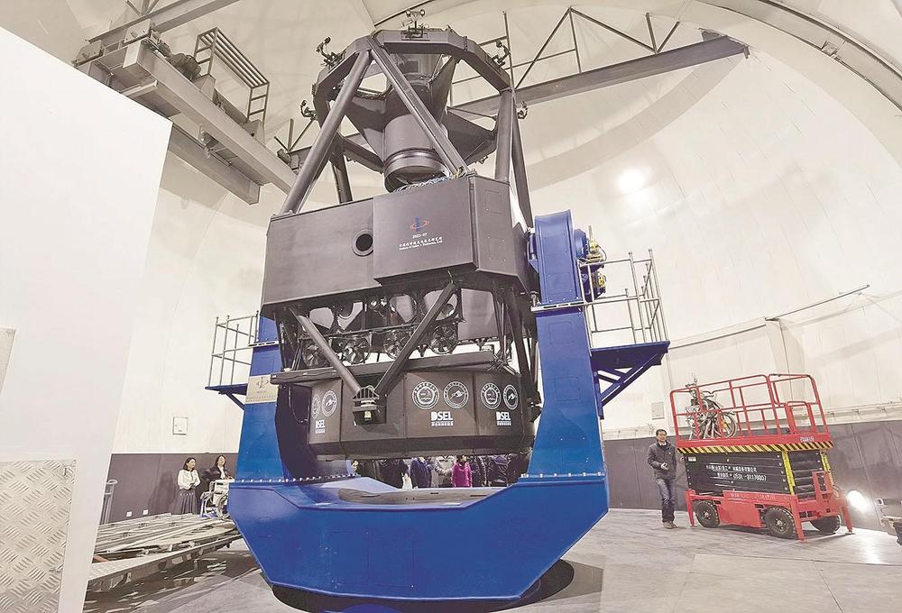 “夜晚,‘墨子’工作的时候,就将它打开,这个顶等于是它的防护罩。”面对墨子巡天望远镜,运维工作人员介绍,“上面是它的主镜,口径2.5米,中间开孔0.76米,主镜厚度0.12米,面形平整度优于8纳米,主镜主动光学支撑采用轴向气压式54点支撑……”