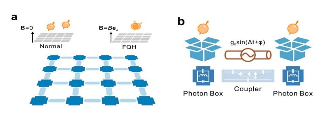 为解决这一重大挑战,科研团队在国际上自主研发并命名了一种新型超导量子比特Plasmonium,打破了目前主流的Transmon(传输子型)量子比特相干性与非简谐性之间的制约,用更高的非简谐性提供了光子间更强的排斥作用。进一步,团队通过交流耦合的方式构造出作用于光子的等效磁场,使光子绕晶格的流动可积累Berry(贝里)相位,解决了实现光子分数量子反常霍尔效应的两个关键难题。