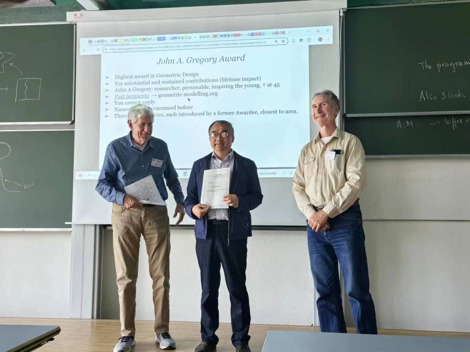 John A. Gregory纪念奖是几何设计领域的最高荣誉,以纪念计算机辅助几何设学科的奠基人之一John Gregory的卓越贡献。该奖项每三年颁发一次,旨在表彰在几何建模和计算几何领域做出杰出贡献的个人,评选标准是获奖人在几何设计领域的终身影响。