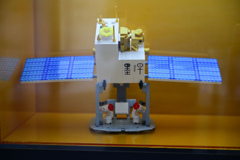 ↑这是展出的全球首颗量子科学实验卫星“墨子号”模型(5月9日摄)。