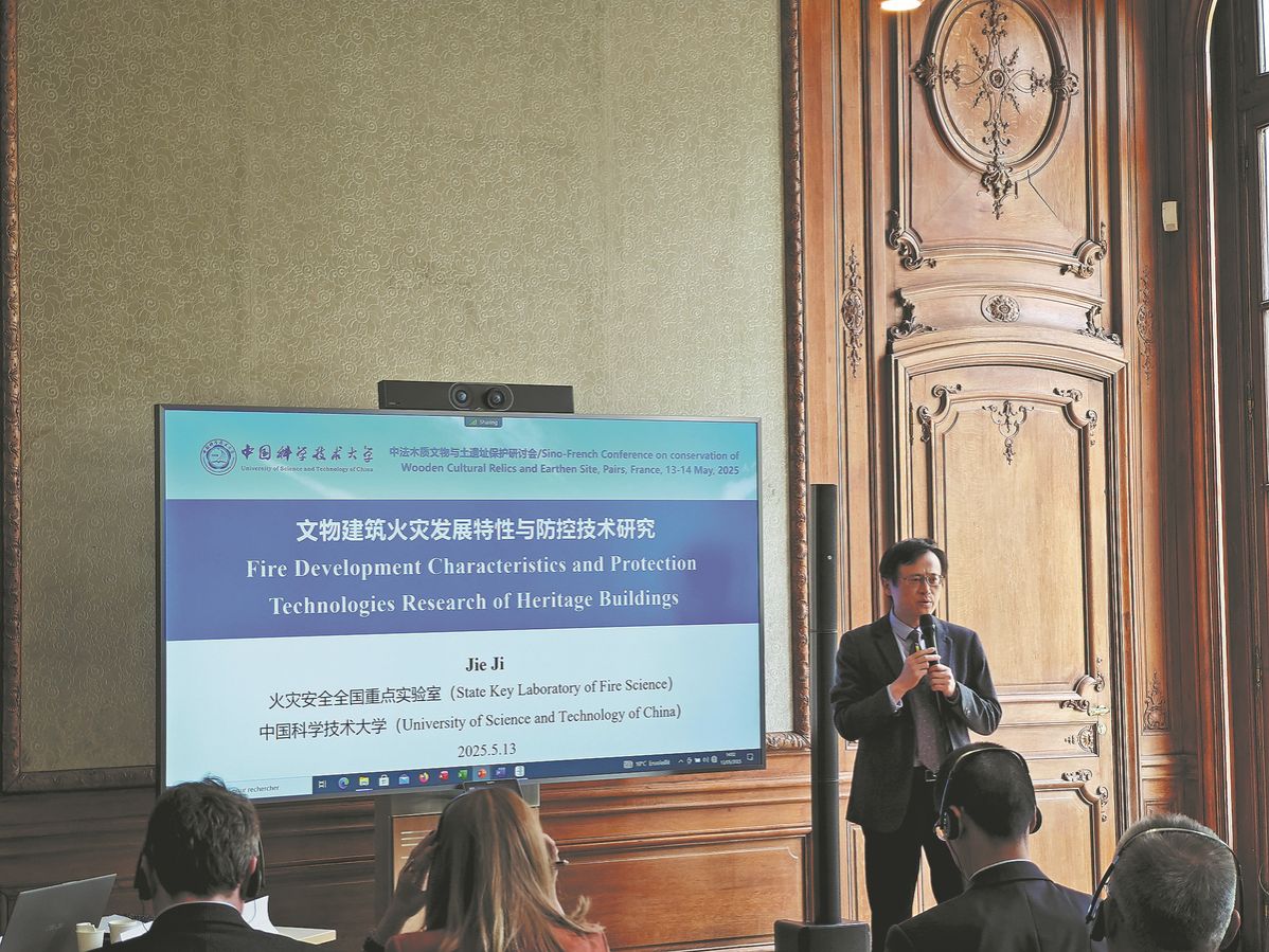 In the Sino-French Conference on Conservation of Wooden Cultural Relics and Earthen Sites, held in Paris from May 13 to 14, Chinese fire scientist Ji Jie gave a speech titled "Fire development characteristics and protection technologies for wooden heritage buildings".