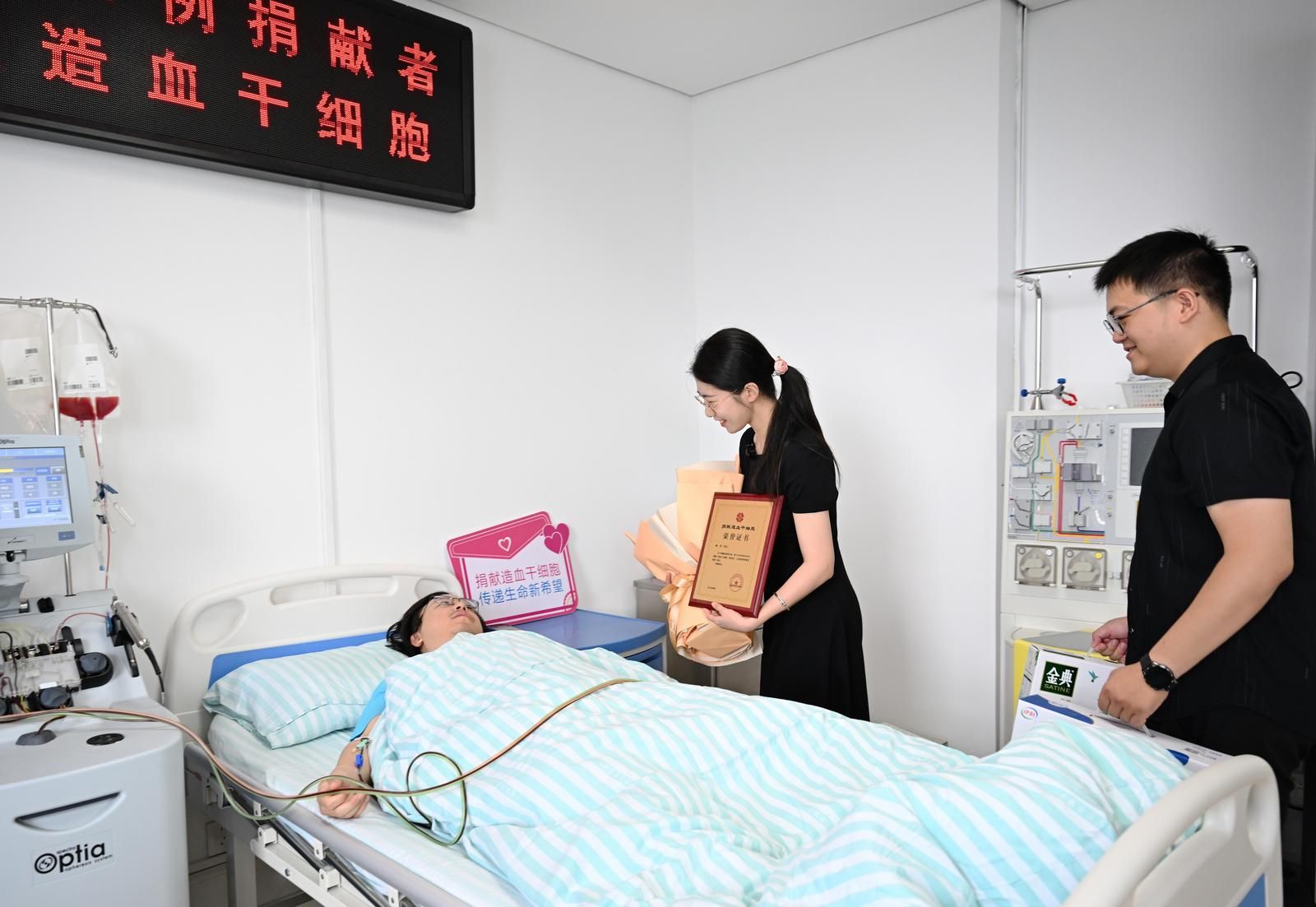 采集完成后,收到“捐献骨髓造血干细胞优秀志愿者”奖牌和证书,李宁成了同学们争相合影的“明星人物”。他也隔空祝福那位不知名的有缘人,希望他好好配合医生治疗,身体早日恢复健康。