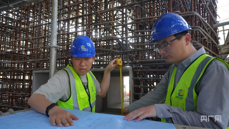 杨玖重(左)和团队成员正在讨论项目建设细节(央广网记者 鲍玉婵 摄)