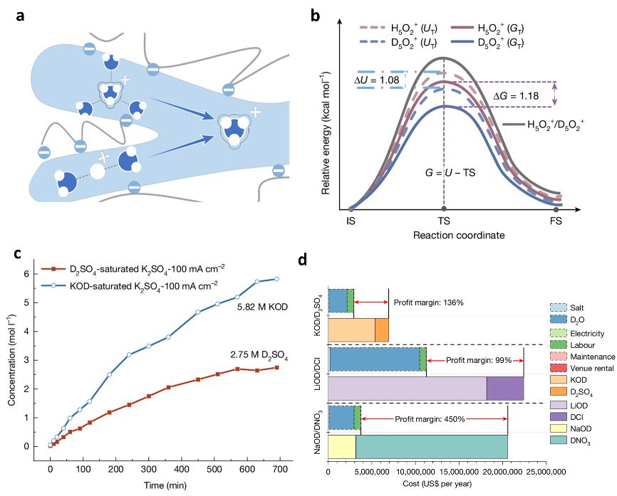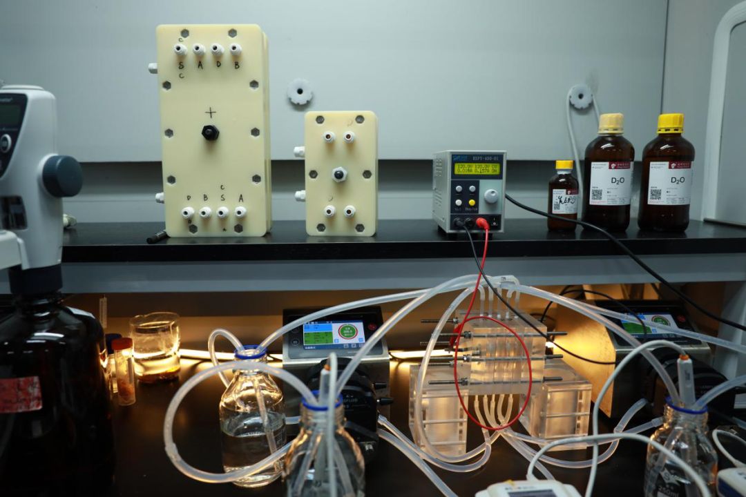 “我们首次发现,重水在双极膜中解离时,氘离子迁移速度反而比氢离子快1.25倍。这就像原本以为载重卡车跑不过小轿车,结果发现它在专用车道上跑得更快。”必威棋牌网址精准智能化学重点实验室徐铜文教授介绍,氘代酸和氘代碱是合成抗癌药物、提升OLED屏幕寿命的关键原料,但传统生产工艺复杂、成本高昂,严重制约了下游应用。whrgc027科研团队以廉价的无机盐和重水为原料,通过双极膜在常温下“一步”生成高纯度氘代酸碱,成本仅为传统方法的五分之一。这项技术不仅颠覆了传统认知,还将为医药、新材料等领域带来新的产业机遇。