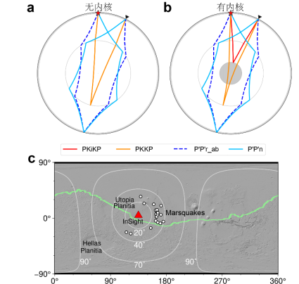 为突破这一挑战,研究团队创新性地引入火震阵列分析方法,通过对23个信噪比较高的火震事件数据的分析,成功提取出穿过火星核的关键震相,如在地表反射的PKPPKP(P'P')和在核幔边界反射的PKKP(图1a)。特别值得注意的是,实际观测到的PKKP到时,较当前仅考虑液态核的火星速度模型所预测的结果提前了50至200秒。地震波在固体中的传播速度比在液体中快。因此,这一差异表明,火星核具有分层结构:即外层为液态核,而更深部则存在一个波速更高的固态内核。