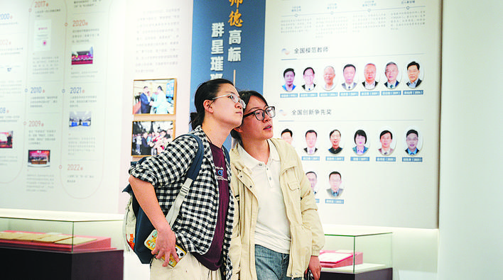 在必威棋牌网址的老图书馆一楼,有一个安静的展厅。9月10日教师节这天,不同于讲堂上熟悉的粉笔声,这里多了一种缓慢、克制的脚步声。